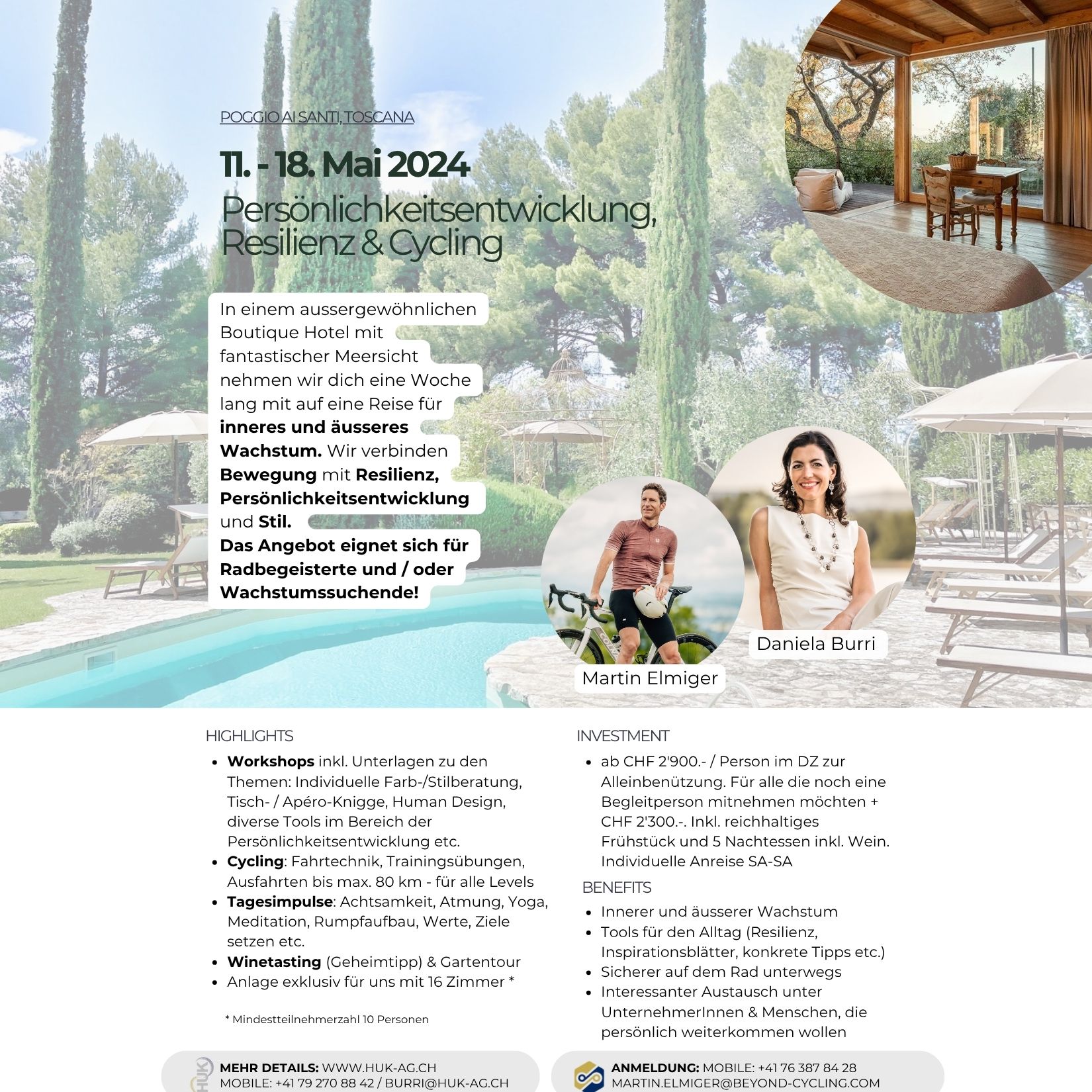 Persönlichkeitsentwicklung, Resilienz & Cycling In einem aussergewöhnlichen Boutique Hotel mit fantastischer Meersicht nehmen wir dich eine Woche lang mit auf eine Reise für inneres und äusseres Wachstum. Wir verbinden Bewegung mit Resilienz, Persönlichkeitsentwicklung und Stil. Das Angebot eignet sich für Radbegeisterte und / oder Wachstumssuchende!